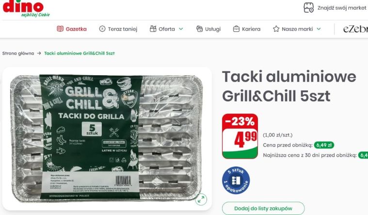W Dino pojawiła się promocja na tacki na grilla Grill&Chill, które sprzedawane są w opakowaniu po 5 sztuk. Ich cena została obniżona o 23% i wynosi obecnie 4,99 zł za zestaw, co daje zaledwie 1 zł za sztukę. To wyraźnie mniej niż standardowe 6,49 zł, dlatego wiele osób decyduje się na zakup kilku opakowań na zapas. Promocja obowiązuje do 21.04.2026, więc czasu na skorzystanie z niej nie ma zbyt wiele. Właśnie takie okazje sprawiają, że sezon grillowy zaczyna się na dobre jeszcze zanim na zewnątrz zrobi się naprawdę ciepło.