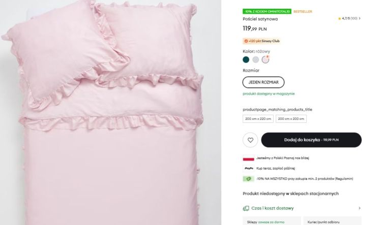 Satynowa pościel z Sinsay była dostępna w trzech kolorach, jednak dwa z nich szybko się wyprzedały, co świadczy o jej niemałym fenomenie. Został już tylko jasnoróżowy wariant, który z pewnością przypadnie do gustu niejednej kobiecie. Pościel ta zebrała 100 opinii, które możemy przeczytać na stronie sklepu. Średnia ocen wynosi 4,7/5, więc jest to produkt godny polecenia.