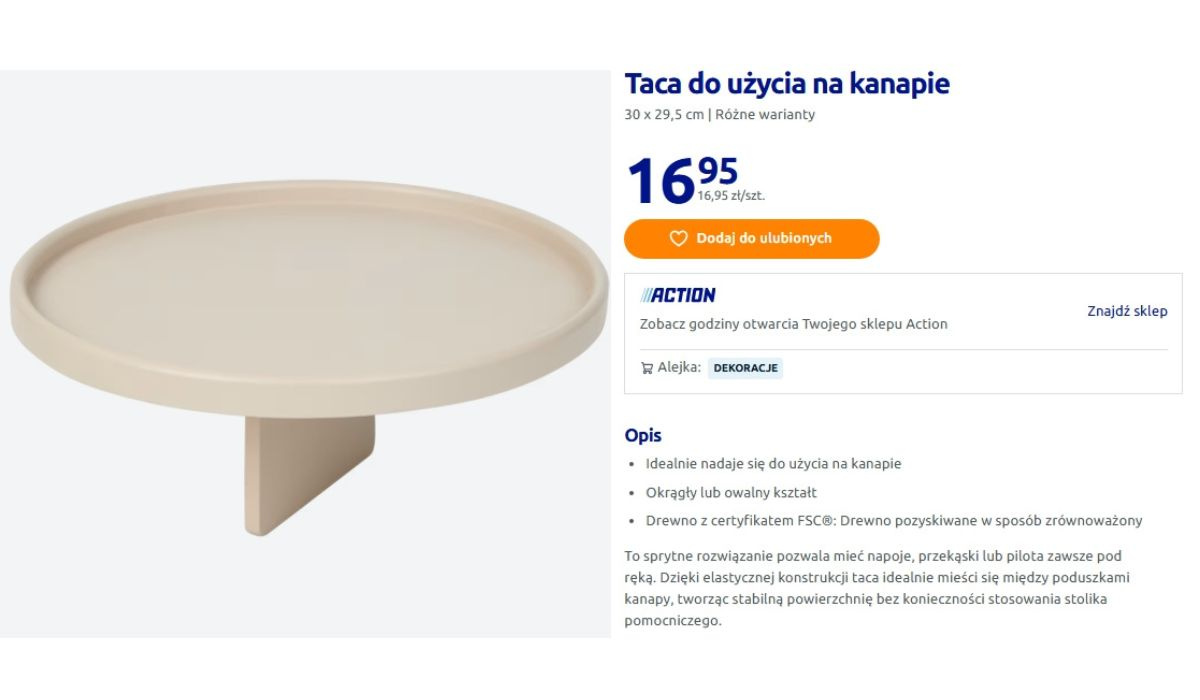 Najlepsze jest to, że to gadżet, który można wykorzystać zarówno podczas sezonu balkonowego, jak i jesienią i zimą w mieszkaniu. To, co jeszcze zachwyciło mnie w tej tacy, to zdecydowanie modny kolor light beige, czyli jasny odcień beżu. Jeśli jednak szukasz innej opcji, w Action dostępne są także inne wersje kolorystyczne – czarna i brązowa. Dzięki temu każdy z pewnością znajdzie coś dla siebie. Do zakupu tacy do użycia na kanapie zachęca również cena. Stoliki na balkon to spory koszt. Najtańsze zaczynają się od około 100 zł, a tutaj możesz cieszyć się niemal identyczną funkcją za jedyne 16,95 zł.