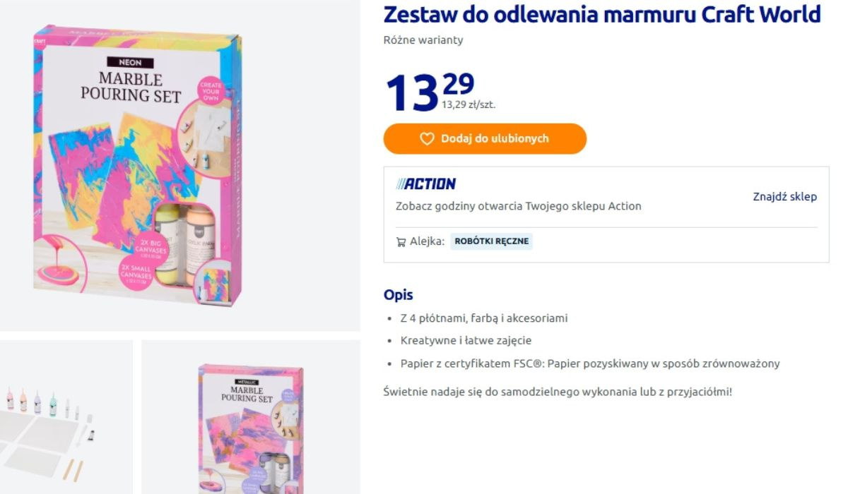 Action ma w swojej ofercie więcej ciekawych propozycji dla osób, które lubią tworzyć. Jednym z nich jest zestaw do odlewania marmuru za 13,29 zł, który pozwala stworzyć efektowne obrazy i dekoracje.