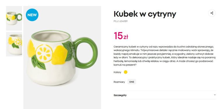 Szłam do Pepco po świecę zapachową. Nic więcej. Ale jak to w Pepco bywa, wystarczyło przejść obok regału z nowościami i plan wziął w łeb. Na półce stał kubek, który od razu przyciągnął wzrok. Żółte cytryny na białym tle, wypukłe detale, które czuć pod palcami, i zielony uchwyt, który wygląda jak mała gałązka. Pierwsza myśl: to musi kosztować z pięćdziesiąt złotych. Odwróciłam, sprawdziłam cenę. 15 złotych. Piętnaście. Za kubek, który wygląda jak z ceramicznej pracowni na Sycylii. Wzięłam dwa od razu, bo wiedziałam, że za tydzień mogą zniknąć z półek.