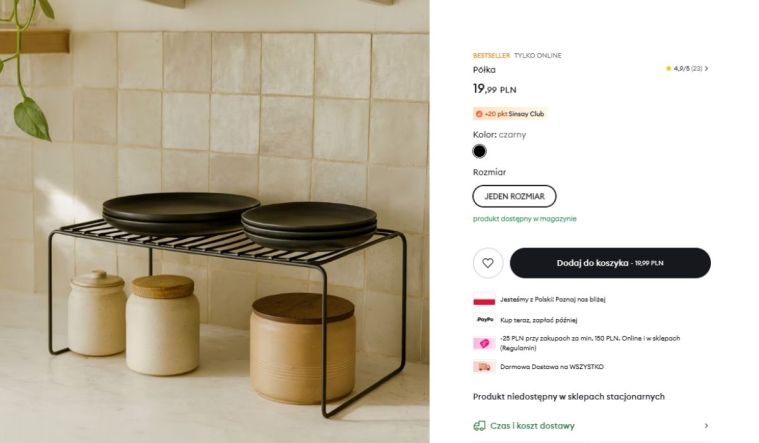To niewielki element, który potrafi znacząco poprawić funkcjonalność szafek. Dodatkowym atutem jest jego lekka wizualnie konstrukcja – nie przytłacza wnętrza szafki i pozwala zachować wrażenie porządku. Dzięki temu nawet mocno wypełniona przestrzeń wygląda bardziej uporządkowanie i estetycznie. A jego cena? Tylko 19,99 zł. To naprawdę mało.
