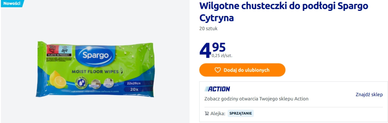 Odpowiedzią na te potrzeby są wilgotne chusteczki do podłogi Spargo Cytryna, które pojawiły się w ofercie Action. W opakowaniu znajduje się 20 szt., a jego cena wynosi 4,95 zł, czyli 25 gr za szt. Produkt przeznaczony jest do czyszczenia podłóg twardych i został opracowany tak, aby nie pozostawiać smug.
