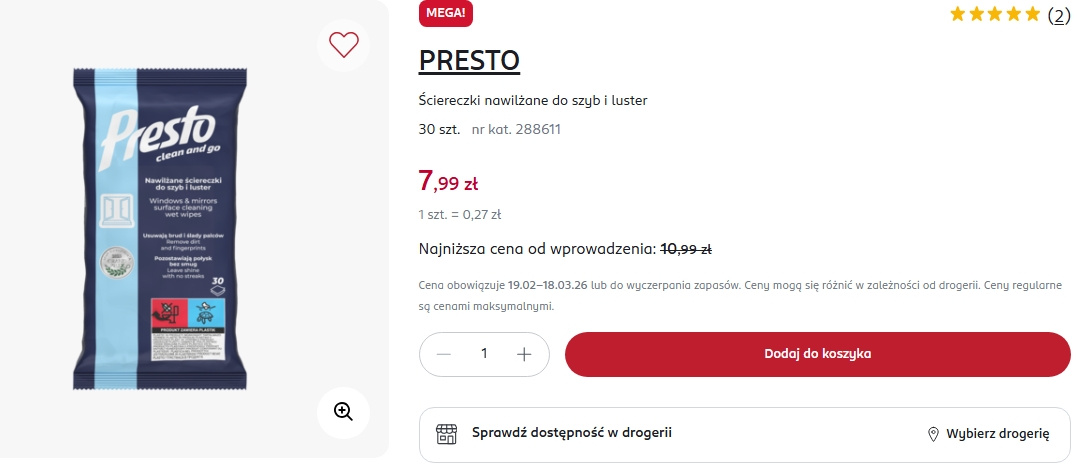 W Rossmannie można znaleźć nawilżane ściereczki do szyb i luster marki Presto. Opakowanie kosztuje 7,99 zł i zawiera 30 sztuk, co daje około 27 groszy za jedną ściereczkę. To niewielki wydatek, a oszczędność czasu jest ogromna.