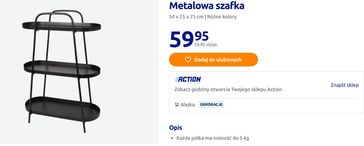 W Action wypatrzyłam metalową szafkę o wymiarach 54 x 25 x 75 cm. Ma trzy poziomy i kosztuje 59,95 zł. Każda półka ma nośność do 5 kg, więc spokojnie mieszczą się na niej doniczki z petuniami, zioła czy małe dekoracje.