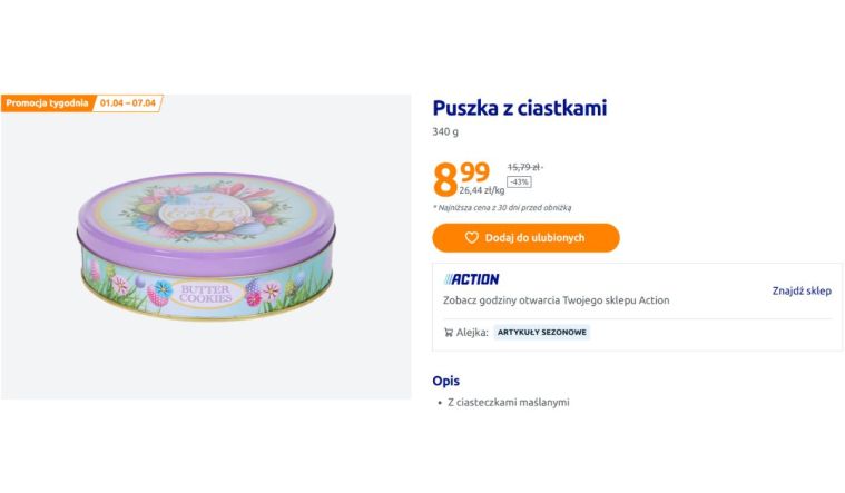 Wielkanocna oferta Action to także szeroki wybór słodyczy w atrakcyjnych cenach. Metalowa puszka z maślanymi ciastkami kosztuje 8,99 zł i oprócz zawartości pełni też funkcję ozdobnego pojemnika. Wśród bardziej typowo świątecznych propozycji znajdziemy żelki Trolli Soft Eggies za 4,49 zł, które kształtem nawiązują do jajek, a także zestawy lizaków wielkanocnych za 6,54 zł czy pojedyncze lizaki z pianki cukrowej już za 2,99 zł.