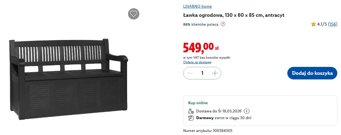 Antracytowa ławka ze schowkiem z Lidla ma wymiary 130 cm szerokości, 60 cm głębokości i 85 cm wysokości, więc spokojnie zmieszczą się na nim dwie osoby. Została wykonana z tworzywa sztucznego, które imituje drewno. Dzięki temu wygląda rustykalnie i elegancko, ale jest dużo łatwiejsza w pielęgnacji niż naturalne deski. Nie trzeba jej impregnować ani martwić się deszczem. Jest odporna na warunki atmosferyczne, więc poradzi sobie i w słońcu, i podczas wiosennych ulew.