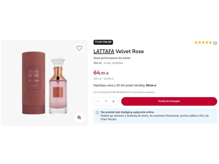 Promocja obowiązuje od 12 marca do 25 marca 2026 roku lub do wyczerpania zapasów, dlatego osoby zainteresowane zapachem mogą chcieć się pospieszyć z zakupem. Tego typu okazje w Rossmannie często szybko znikają, zwłaszcza gdy dotyczą popularnych kategorii jak arabskie perfumy. Zapach Lattafa Velvet Rose to propozycja dla kobiet, które lubią wyraziste i eleganckie kompozycje, a jednocześnie nie chcą wydawać dużych kwot na perfumy.
