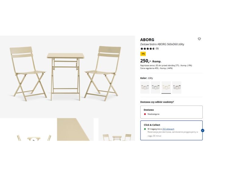 Tutaj mamy 1 stół i 2 krzesła w cenie 250 zł za komplet. To aż 44 procent taniej względem ceny regularnej 450 zł. Nawet najniższa cena z ostatnich 30 dni była wyższa, bo wynosiła 275 zł. Szczerze mówiąc, nigdzie nie znalazłam tak korzystnej oferty za stalowy zestaw na taras czy balkon. A sprawdzałam naprawdę długo, bo zależało mi na czymś, co posłuży kilka sezonów.