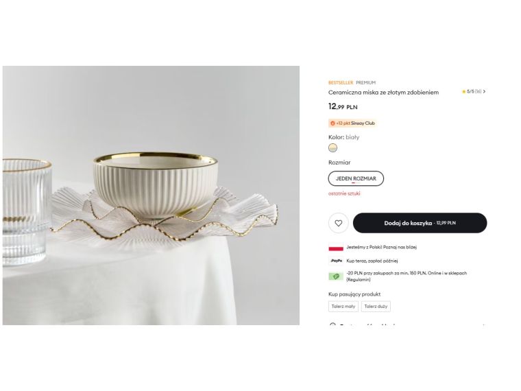 Nie będę ukrywać, trochę zabolało. Ceramiczna miska ze złotym zdobieniem z Sinsay za 12,99 zł wyglądała jak coś, co spokojnie mogłoby stać na stole w dużo droższym sklepie. Miała w sobie tę lekko odświętną nutę, ale bez przesady. Taki detal, który od razu przyciąga wzrok i sprawia, że zwykłe cukierki, pralinki czy czekoladki wyglądają po prostu ładniej. Nic więc dziwnego, że produkt dostał ocenę 5 na 5 i aż 16 opinii. Jedna z komentujących napisała wprost: