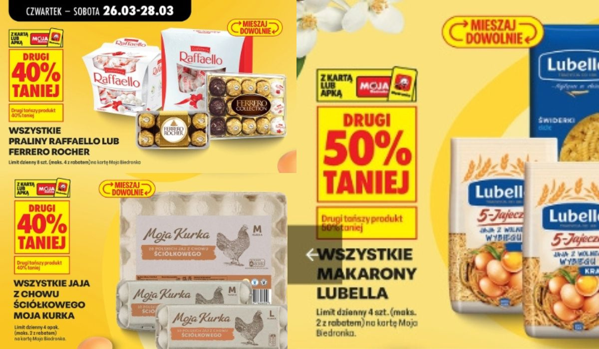 Na takich zasadach kupisz między innymi makarony z Lubelli, gdzie drugi produkt jest o połowę tańszy. To świetna opcja, jeśli robisz zapas na dłużej albo planujesz kilka obiadów z wyprzedzeniem. Podobnie wygląda sytuacja ze słodyczami, popularne praliny jak Raffaello czy Ferrero można kupić z dużą zniżką przy zakupie większej ilości, co przed świętami naprawdę się przydaje.
