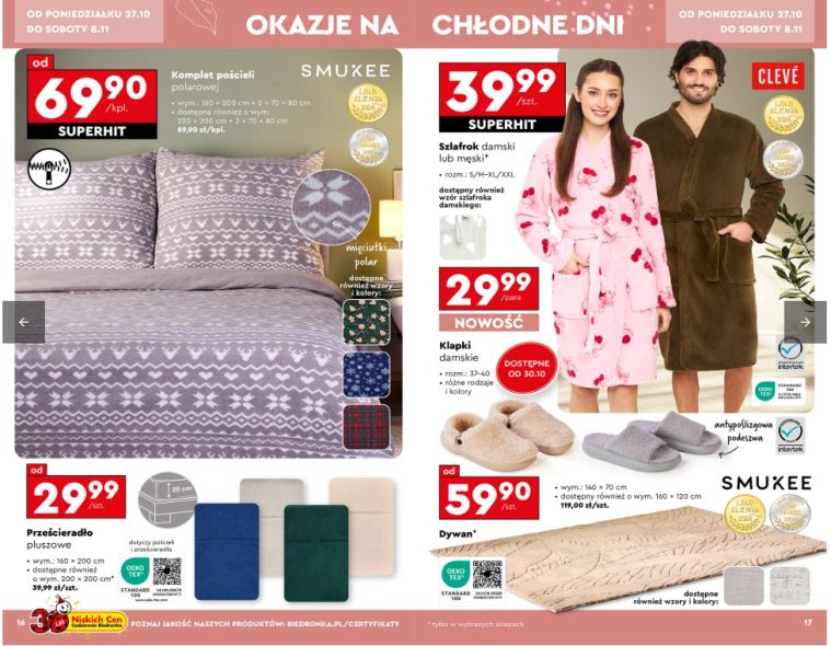 Jesień rozgościła się już na dobre, a wraz z nią przyszły chłodne wieczory i poranki. Właśnie teraz warto pomyśleć o tym, jak uprzyjemnić sobie czas spędzany w domu. Biedronka przygotowała ofertę, która pomoże wam zadbać o ciepło i komfort – od miękkiej pościeli po przytulne ubrania i dodatki. Promocja potrwa tylko do 8 listopada, więc to dobry moment, by zajrzeć do sklepu i wybrać coś dla siebie.