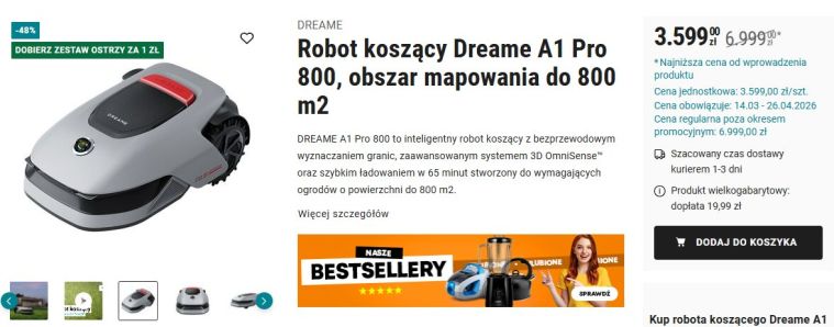 Promocja ogrodowa w Biedronce trwa do 26 kwietnia 2026. Robot koszący DREAME A1 Pro 800 za 3599 zł to jedna z najniższych cen na rynku za model obsługujący działki do 800 m². Kto pierwszy, ten lepszy.