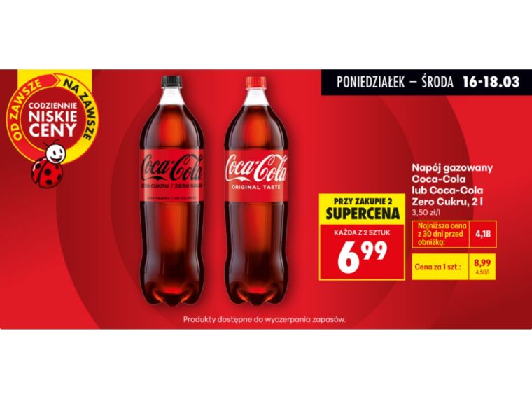 Na promocję trafiły także napoje gazowane. Przy zakupie dwóch butelek Coca-Coli lub Coca-Coli Zero o pojemności 2 litrów każda z nich kosztuje 6,99 zł, co daje około 3,50 zł za litr napoju. Standardowa cena jednej butelki wynosi 8,99 zł, dlatego oferta może być atrakcyjna dla osób robiących większe zakupy.