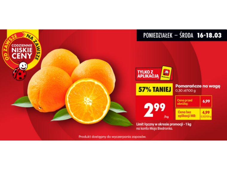 Jeszcze większa obniżka dotyczy pomarańczy sprzedawanych na wagę. Z aplikacją klienci zapłacą 2,99 zł za kilogram, co oznacza rabat sięgający 57 proc. względem wcześniejszej ceny 6,99 zł/kg. Również tutaj wprowadzono limit – maksymalnie 1 kg na konto w trakcie trwania promocji.