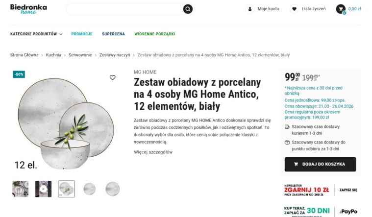 Promocja na ten zestaw obiadowy trwa od 21 marca do 26 kwietnia 2026 roku, a jego cena została obniżona do 99 zł z regularnych 199 zł. Trudno nie zauważyć, że to jedna z tych ofert, które szybko znikają, bo łączą dobry design z naprawdę atrakcyjną ceną. W tej kwocie rzadko można znaleźć zastawę porcelanową o tak dopracowanym wyglądzie.
