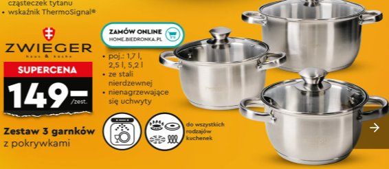 W ramach listopadowej akcji promocyjnej Biedronka oferuje komplet trzech garnków marki Zwieger za zaledwie 149 zł za zestaw. Cena regularna zestawu to 399 zł, wiec mamy tu promocję -60%. W pudełku znajdziesz naczynia o pojemnościach 1,7 l, 2,5 l oraz 5,2 l ze stali nierdzewnej. To materiał, który słynie z trwałości i odporności na zarysowania. Garnki są też kompatybilne ze wszystkimi rodzajami kuchenek: gazowymi, indukcyjnymi, elektrycznymi i ceramicznymi.