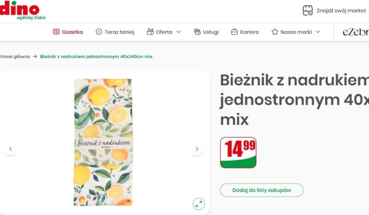 W ofercie Dino pojawił się bieżnik o wymiarach 40 x 140 cm, który kosztuje zaledwie 14,99 zł. To model z jednostronnym nadrukiem, dostępny w różnych wariantach, ale to właśnie wersja w cytryny robi największe wrażenie. Jasne tło połączone z intensywnie żółtymi owocami, zielonymi liśćmi i delikatnymi kwiatowymi akcentami tworzy kompozycję, która od razu przyciąga wzrok.