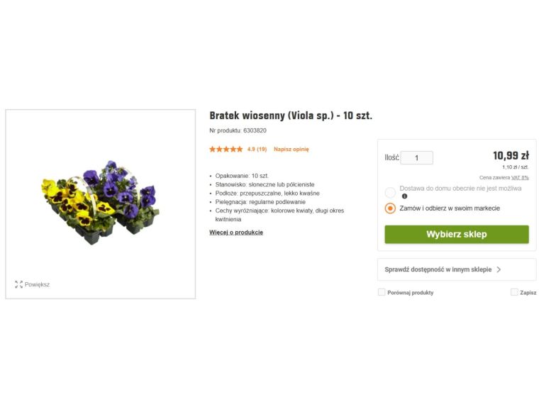 Warto jednak pamiętać, że bratki dopiero zaczynają pojawiać się w sprzedaży i na razie nie są dostępne w każdym sklepie stacjonarnym. W niektórych marketach można je już znaleźć na dziale ogrodniczym, w innych dopiero trafią na półki w najbliższych tygodniach. Z tego powodu przed wyjściem na zakupy najlepiej sprawdzić dostępność na stronie internetowej danej sieci. Zarówno Leroy Merlin, jak i OBI pokazują w swoich serwisach, czy rośliny są dostępne w konkretnym sklepie oraz ile sztuk znajduje się aktualnie na stanie.