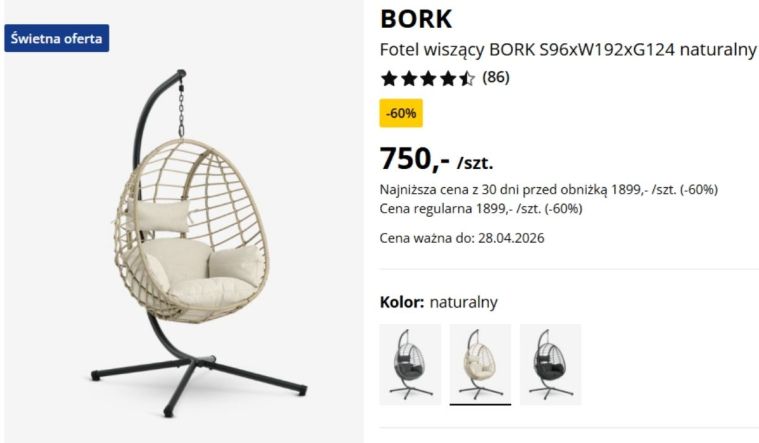 Teraz najważniejsze. Ten model pojawił się jako fotel wiszący na wyprzedaży z rabatem aż 60%, co w praktyce oznacza spadek ceny z 1899 zł do około 750 zł. Przy takiej jakości i wykonaniu to jedna z tych promocji w Jysk, obok których naprawdę trudno przejść obojętnie.