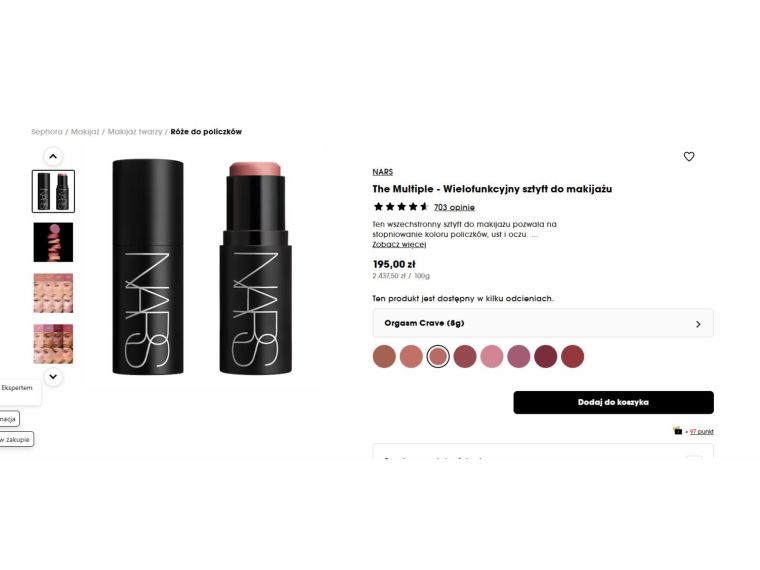 Róż od Nars z Sephory to produkt, który można stosować na policzki, usta i oczy. Naprawdę kocham takie produkty. Mam wszystko w jednym i na miejscu. Ma kremową formułę i pozwala stopniować intensywność koloru. Dzięki temu łatwo uzyskać zarówno delikatny, dzienny makijaż, jak i mocniejszy efekt na wieczór. To kosmetyk znany i ceniony, z setkami opinii.