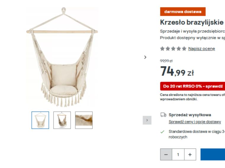 W ofercie Castorama pojawiła się promocja na krzesło brazylijskie Corciano w kolorze beżowym. Obecnie kosztuje 74,99 zł, podczas gdy jego regularna cena to 99,99 zł. Różnica może nie wydaje się ogromna, ale przy urządzaniu balkonu każdy zaoszczędzony grosz ma znaczenie.