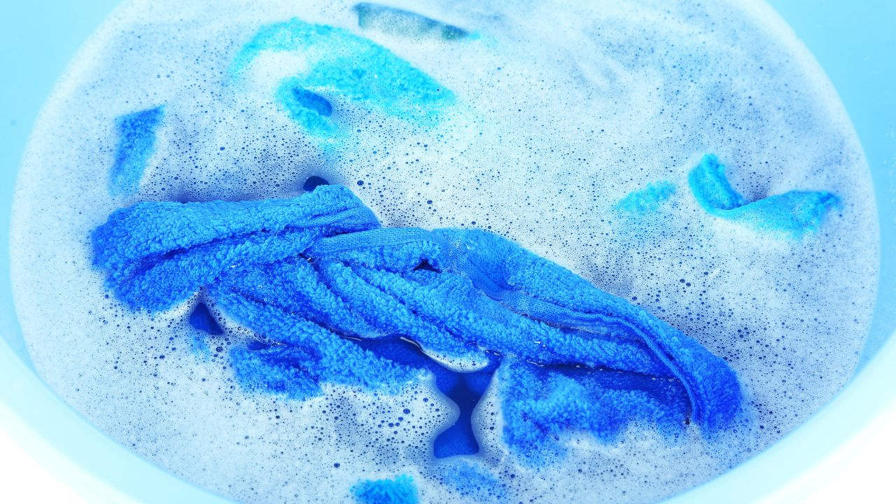 Następnie wkładam ręczniki do takiej mieszanki i zostawiam na kilkanaście minut. To bardzo ważny etap, bo właśnie wtedy włókna się rozluźniają, a nagromadzony osad zaczyna się rozpuszczać. Można delikatnie je poruszyć w wodzie, żeby mikstura dotarła w każde miejsce.