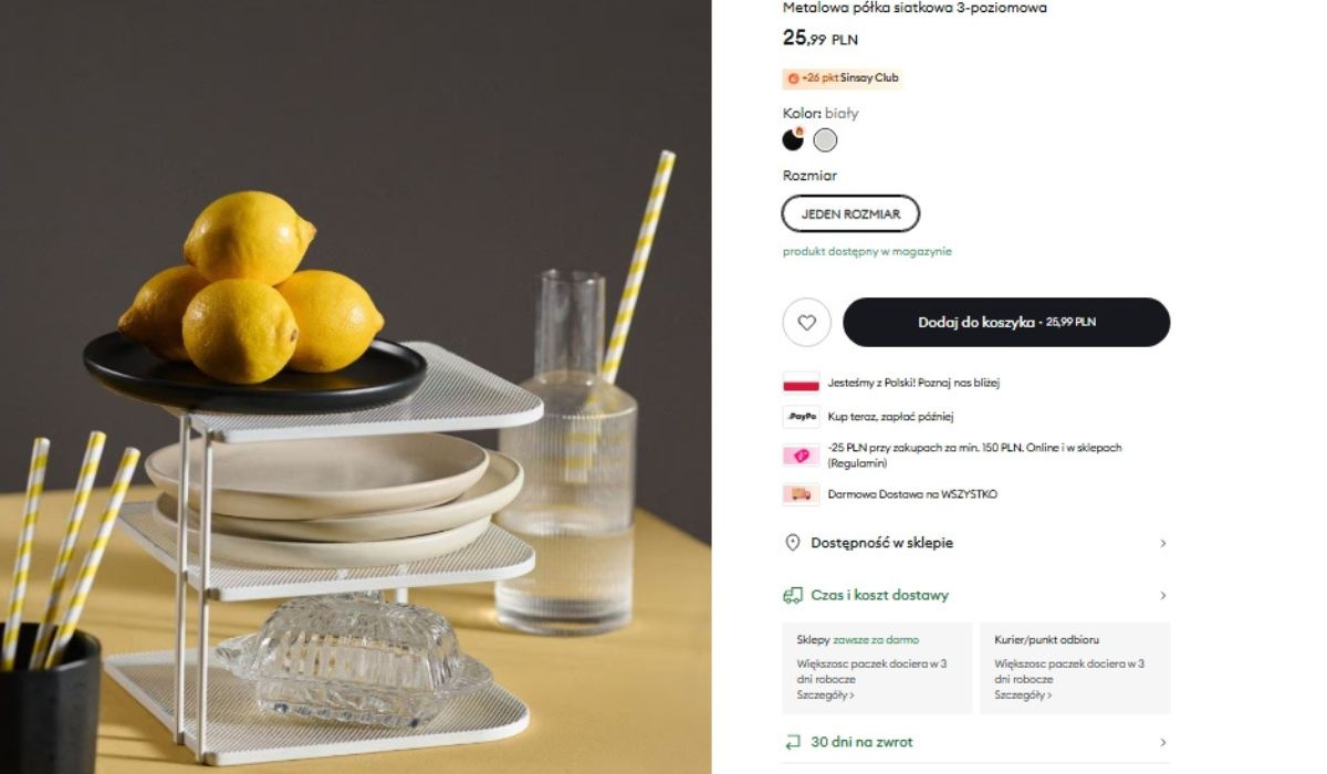 Organizer ma kompaktowe wymiary, dzięki czemu nie ma problemu z wstawieniem go do segmentu. Ponadto, jeśli twoje szafki są naprawdę wysokie, możesz ustawić 2 egzemplarze na sobie. To sprawi, że uda ci się pomieścić jeszcze więcej produktów. Dodatkowym atutem 3-poziomowego dodatku do kuchni z Sinsay jest również solidne wykonanie. Z jednej strony organizer jest lekki, a z drugiej stabilny i łatwy do utrzymania w czystości. Dzięki temu masz pewność, że będzie dobrze spełniał swoją funkcję przez długie lata.