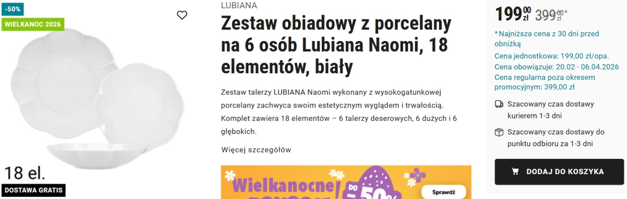 Z informacji zamieszczonych na stronie internetowej Biedronka Home wynika, że wyprzedaż na zestaw obiadowy Lubiana Naomi potrwa jeszcze do 6 kwietnia 2026 r. Nie należy jednak zwlekać z decyzją o zakupie do samego końca. Towar ten cieszy się ogromnym zainteresowaniem, więc może zniknąć z magazynów znacznie szybciej.