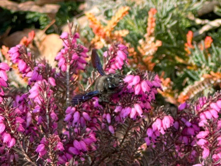 Jeżeli więc macie w swoim ogrodzie rośliny kwitnące, które wabią różnych zapylaczy, może się u was pojawić także zadrzechnia fioletowa. Teraz, już w połowie marca, zauważyłam ją u siebie na wrzoścu – zapylała go pracowicie razem z kilkoma dużymi trzmielami. Być może warto więc mieć u siebie tę roślinę, która jak widać bardzo się spodobała czarnej pszczole z mojej okolicy. Sprawdzić może się też budleja Dawida czy lawenda.