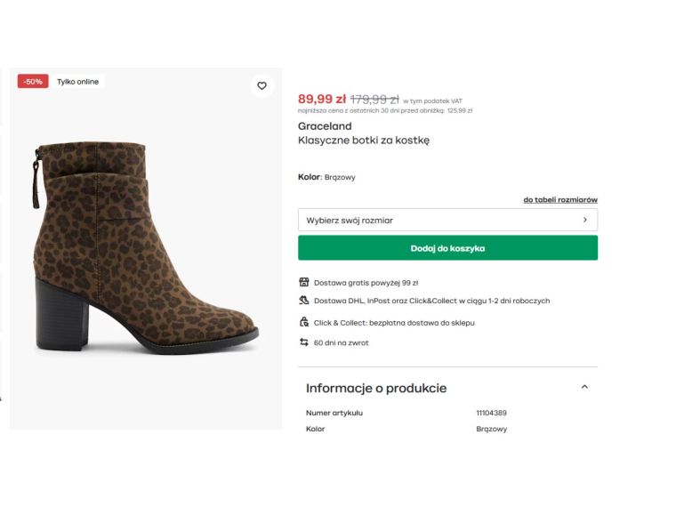 To botki w brązowym odcieniu ze zwierzęcym wzorem, które kosztują teraz 89,99 zł zamiast 179,99 zł, a najniższa cena z ostatnich 30 dni przed obniżką wynosiła 125,99 zł. Taki print dodaje stylizacji charakteru, ale dzięki ciepłej tonacji nie wygląda przesadnie. Jeśli do tej pory wybierałaś wyłącznie gładkie modele, ten może być miłym przełamaniem garderoby.