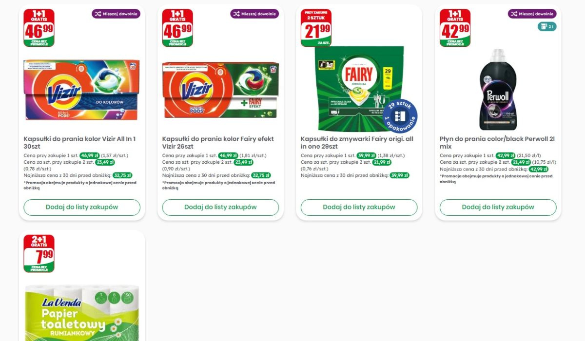 Bardzo ciekawie wypadają też kapsułki do zmywarki Fairy. Przy zakupie dwóch opakowań cena spada do 21,99 zł za jedno, co przy 29 kapsułkach w środku naprawdę robi świetny wynik. W porównaniu do regularnych cen w innych sklepach różnica jest wyraźna i odczuwalna już przy pierwszym zakupie.