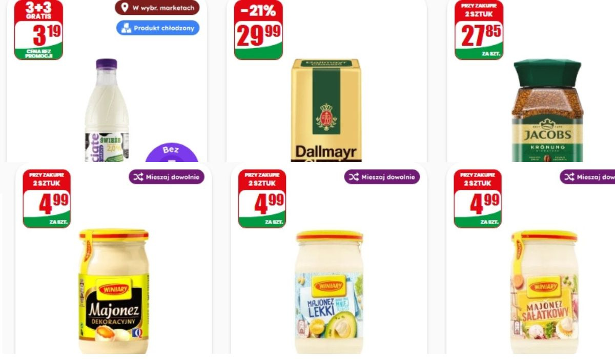 Bardzo dobrze wypada też mleko świeże bez laktozy 2%. Przy większym zakupie cena może spaść nawet do 1,59 zł za butelkę. Nie zabrakło też kawy, a to przecież produkt, bez którego wiele osób nie wyobraża sobie poranka. Kawa mielona Dallmayr Classic 500 g kosztuje 29,99 zł, co jest wyraźną obniżką i od razu widać, że warto dorzucić ją do koszyka. Z kolei dla fanów kawy rozpuszczalnej jest Jacobs Kronung 200 g. Przy zakupie dwóch opakowań cena spada do 27,85 zł za sztukę, więc wychodzi dużo korzystniej niż przy pojedynczym zakupie.