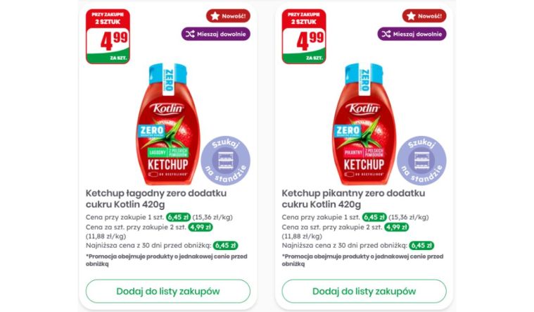 Warto zwrócić uwagę także na musztardę Develey o wadze 328 g, która kosztuje 4,99 zł i może być klasycznym dodatkiem do kiełbasek czy burgerów. Dla osób szukających lżejszych opcji dostępny jest ketchup Kotlin Zero 420 g. W promocji przy zakupie dwóch sztuk jego cena spada do 4,99 zł za opakowanie, podczas gdy standardowo kosztuje 6,45 zł. To rozwiązanie dla tych, którzy chcą ograniczyć cukier, ale nie rezygnować z ulubionych smaków.