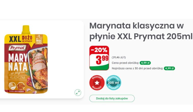 To, co szczególnie przyciąga uwagę, to wygodna forma płynnej marynaty. Wystarczy wlać ją do mięsa i odstawić na krótki czas, bez konieczności samodzielnego komponowania przypraw. Producent deklaruje, że jedno opakowanie wystarcza nawet na około 1,8 kg mięsa, co czyni je praktycznym rozwiązaniem na większe spotkania. W Dino takie nowości często szybko znikają z półek, zwłaszcza gdy pojawia się dodatkowy rabat.