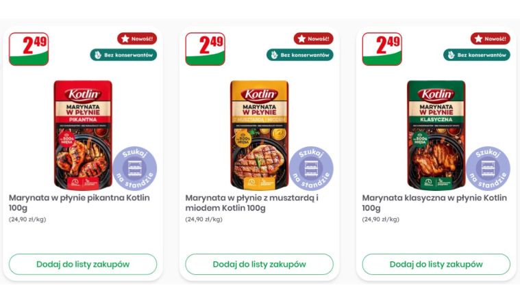Obok nowych produktów w sklepach Dino nie brakuje też sprawdzonych i znacznie tańszych opcji, które mogą zainteresować osoby szukające oszczędności. W ofercie pojawiły się marynaty w płynie Kotlin o gramaturze 100 g w cenie 2,49 zł. Do wyboru są różne warianty smakowe, w tym klasyczna, pikantna oraz wersja z dodatkiem musztardy i miodu, co pozwala dopasować smak do rodzaju mięsa i preferencji gości.
