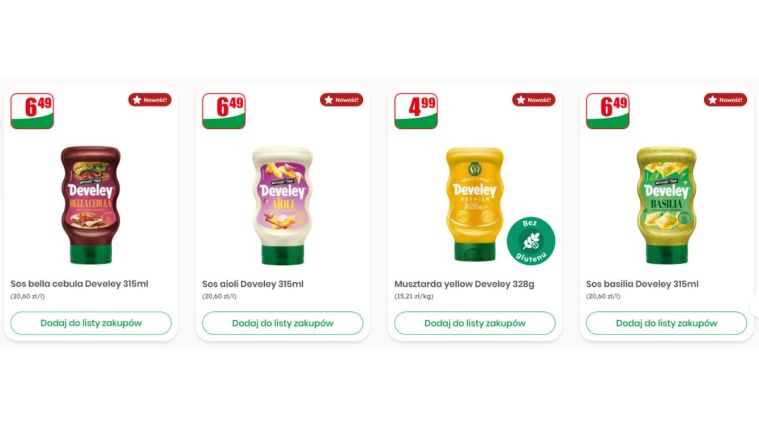 Kompletowanie zakupów na grilla w Dino nie kończy się na marynatach. Na półkach pojawiło się sporo dodatków, które mogą uzupełnić majówkowy zestaw. Wśród nich znajdują się sosy Develey o pojemności 315 ml w cenie 6,49 zł za sztukę. Do wyboru są m.in. warianty aioli, basilico czy bella cebula, które dobrze komponują się zarówno z mięsem, jak i grillowanymi warzywami.