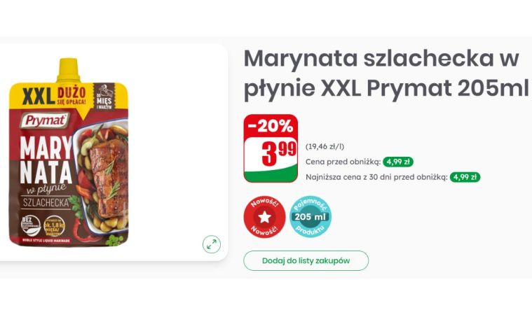 Wśród najciekawszych propozycji na majówkę w Dino wyróżniają się marynaty w płynie XXL od Prymat, które pojawiły się jako nowość i już zostały objęte promocją. Zarówno wersja szlachecka, jak i klasyczna o pojemności 205 ml kosztują teraz 3,99 zł, co oznacza 20% rabatu względem wcześniejszej ceny 4,99 zł. W przeliczeniu daje to około 19,46 zł za litr, co przy tej kategorii produktów jest bardzo konkurencyjną ofertą.