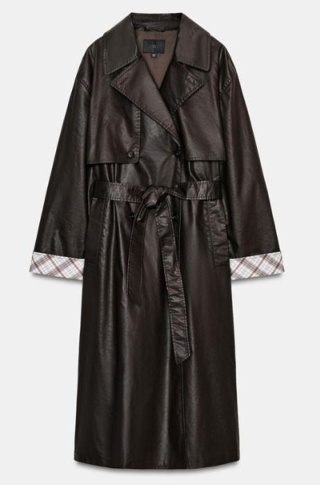 Jeśli zajrzysz do Zara, szybko zauważysz trencz w bardzo podobnym odcieniu brązu. Model z tej sieciówki kosztuje 299 zł i wykonany jest z woskowanej tkaniny w subtelną kratę. To właśnie ten detal odróżnia go od propozycji z Sinsay i nadaje mu bardziej wyrafinowany, lekko retro charakter.