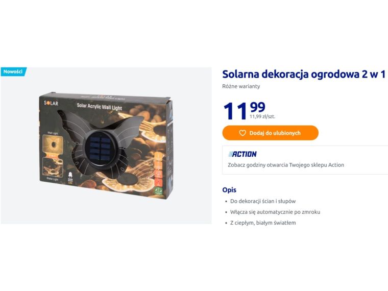 Motyl został zaprojektowany jako dekoracja do ścian i słupów, ale równie dobrze sprawdzi się jako element ozdobny wśród roślin. Wbudowany czujnik zmierzchu sprawia, że lampka włącza się automatycznie po zapadnięciu ciemności, emitując ciepłe, białe światło. Nie trzeba pamiętać o jej uruchamianiu ani wyłączaniu – wystarczy ustawić ją w miejscu, gdzie w ciągu dnia będzie miała dostęp do słońca. W cenie 11,99 zł Action oferuje rozwiązanie, które łączy funkcję praktyczną z dekoracyjną. To także dobra opcja dla osób, które chcą przetestować oświetlenie solarne bez większej inwestycji i w razie potrzeby dokupić kilka sztuk, tworząc spójną aranżację.