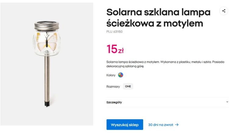 Wśród sezonowych nowości w Pepco znalazły się proste i czarujące lampki solarne z motylkami. Na krótkim, metalowym paliku zamocowany jest słoik, a w środku sztuczny motyl. Zakrętka słoika to jednocześnie mały panel solarny, dzięki któremu lampa ładuje się w ciągu dnia. Wieczorem i nocą świeci delikatnym, ciepłym światłem. Jedna sztuka kosztuje tylko 15 zł, więc warto kupić od razu kilka.