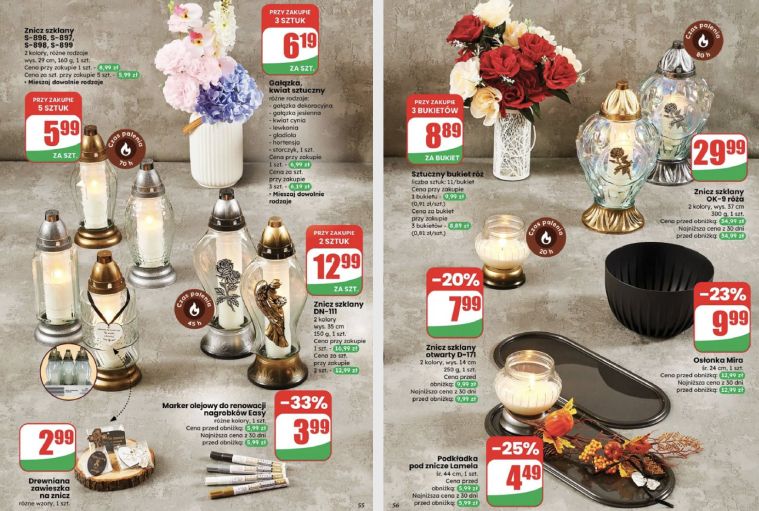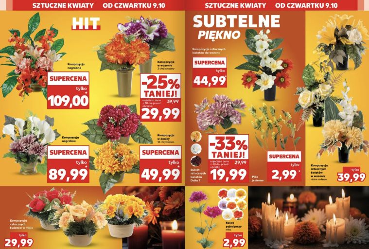 Kaufland natomiast przyciąga rabatami – w tym roku obniżono ceny m.in. kompozycji z trzema chryzantemami w wazonie do 29,99 zł (25% taniej) oraz bukietów sztucznych dalii za 19,99 zł zamiast 29,99 zł. Promocje trwają do 15 października, więc warto zajrzeć do gazetki i porównać, które zestawy będą najlepiej pasować do tego, jak chcesz udekorować groby bliskich.