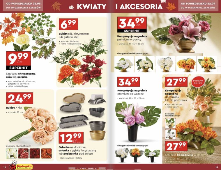 Biedronka postawiła w tym roku na klasykę i stonowaną elegancję. W gazetce sieci można znaleźć pojedyncze kwiaty i gałązki w cenie 9,99 zł – to między innymi sztuczne chryzantemy, róże czy różnorodne gałązki dekoracyjne o wysokości od 50 do 90 cm. Wszystkie utrzymane są w typowo jesiennej tonacji.