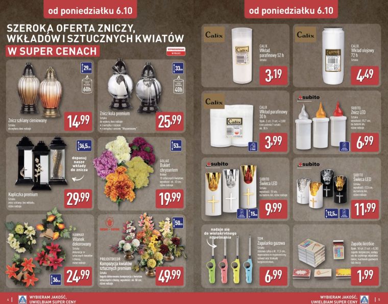 W Aldi królują gotowe, efektowne kompozycje. Wysokie bukiety z 18 chryzantem kosztują 19,99 zł, a duże, premium zestawy sięgające 50 cm wyceniono na 49,99 zł. Można też znaleźć dekorowane wianki o długości około 36 cm w cenie 24,99 zł. To opcje dla tych, którzy wolą mieć wszystko gotowe – wystarczy postawić je na nagrobku. W ofercie dominują stonowane kolory, ale można znaleźć też coś bardziej wyrazistego, jeśli lubisz mocniejsze akcenty.