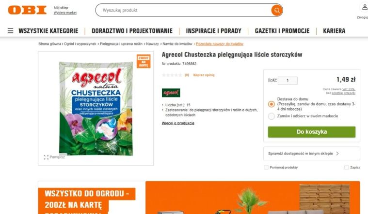 W Obi można znaleźć rozwiązanie, które na pierwszy rzut oka wydaje się banalne, ale w praktyce robi ogromną różnicę. To chusteczki do storczyka marki Agrecol, sprzedawane w opakowaniu po 15 sztuk za 1,49 zł, co po przeliczeniu daje około 10 groszy za jedną sztukę.