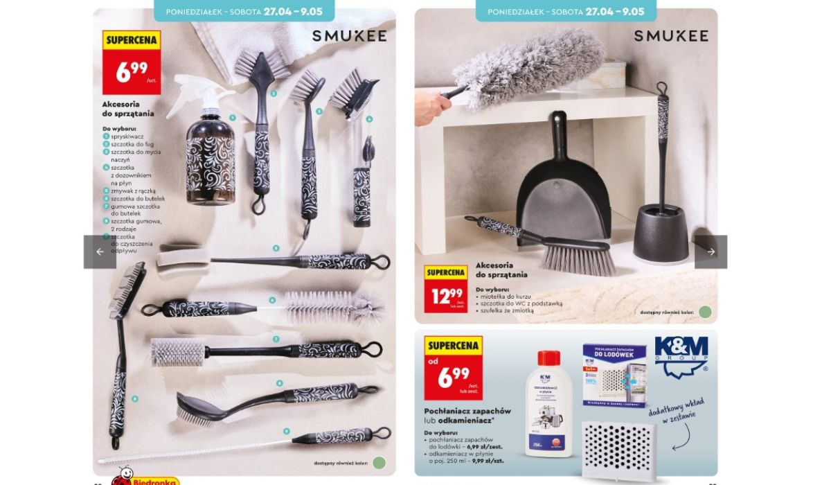 W ofercie są też zestawy typu zmiotka i szufelka oraz szczotki do WC z podstawką w cenie 12,99 zł. Proste, ale bardzo potrzebne rzeczy. Jeśli są dobrze wykonane, mogą służyć naprawdę długo i nie trzeba ich co chwilę wymieniać. Dodatkowo pojawią się pochłaniacze zapachów do lodówki już od 6,99 zł oraz odkamieniacze w płynie za 9,99 zł. To produkty, o których często się zapomina, a które mają ogromny wpływ na świeżość i czystość w domu. Szczególnie w kuchni widać różnicę już po pierwszym użyciu.
