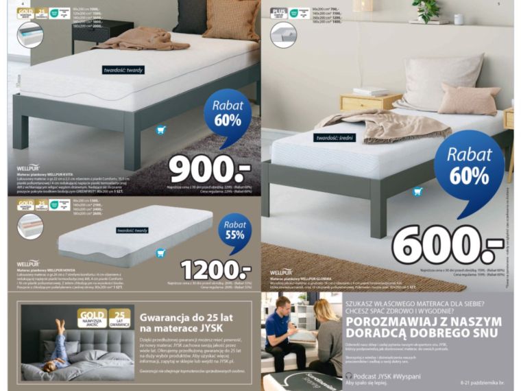 Ponadto do 21 października w sklepach stacjonarnych zgarnąć można dodatkowy rabat sięgający 20% na dowolny materac z matą ochronną, który obowiązuje również na już przecenione artykuły (ale z wyłączeniem tych oznaczonych jako „zawsze niska cena”). Warto dodać, że przed zakupem materaca w Jysk istnieje możliwość konsultacji z doradcą dobrego snu, który pomoże dobrać odpowiedni produkt wedle upodobań i potrzeb. Co istotne, sieć oferuje 25-letnią gwarancję na duży wybór materacy (nie obejmuje ona topmateraców sprzedawanych osobno).