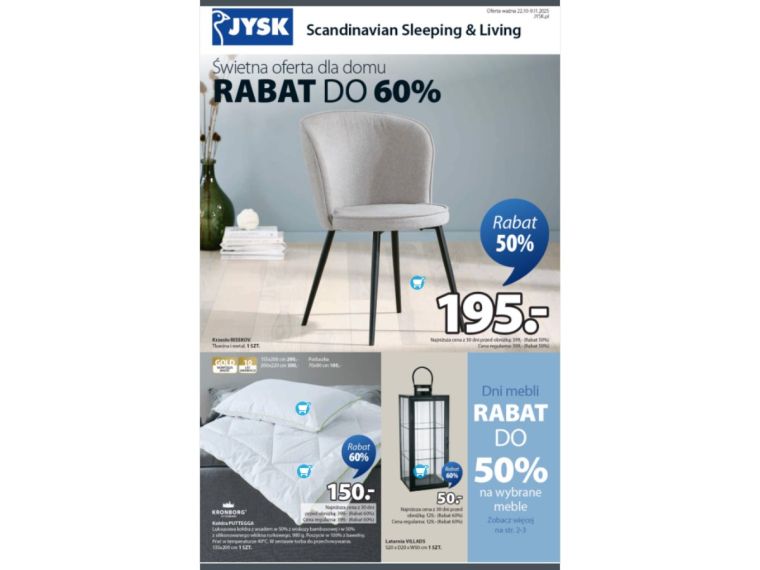 Promocyjna oferta na tanie meble w Jysk potrwa do 9 listopada. Obejmuje ona asortyment zarówno dostępny stacjonarnie, jak i w sklepie internetowym. Warto zwracać uwagę na oznaczenia produktów w sklepie online – niektóre z nich nie są dostępne z dostawą, za to można je odebrać w sklepie stacjonarnym lub na odwrót, w sklepach stacjonarnych nie są możliwe do nabycia, ale z dostawą już tak.