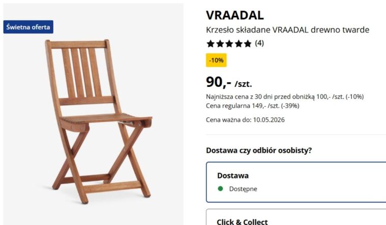 To drewniane krzesło z Jysk, model VRAADAL wykonany z drewna eukaliptusowego, trafiło na promocję, która naprawdę robi różnicę. Aktualnie kosztuje 90 zł za sztukę zamiast 149 zł, a taka obniżka od razu przyciąga uwagę, szczególnie jeśli planujesz większe zakupy do ogrodu. Promocja obowiązuje do 10 maja 2026 roku, więc czasu nie jest dużo i wiele osób decyduje się działać od razu. Dokładnie tak zrobiła moja mama. Zamiast kupować pojedyncze krzesła, wzięła od razu sześć, żeby przygotować ogród na majówkę i mieć gotowe miejsce dla gości.