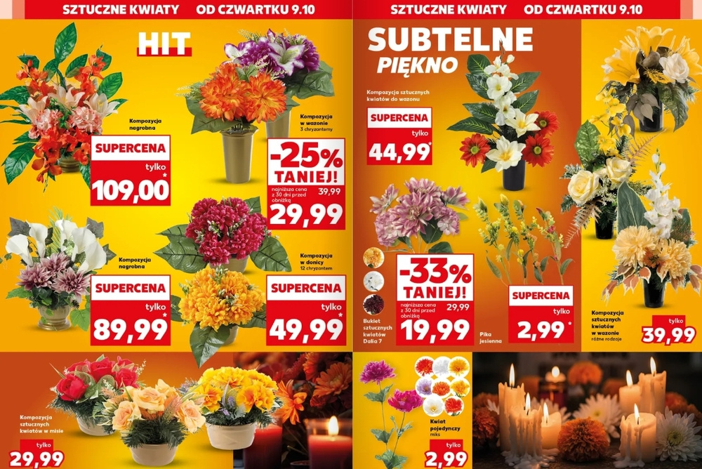 W bieżącym sezonie ceny sztucznych kwiatów w wielu sklepach osiągają kosmiczne ceny, ale w Kauflandzie sytuacja wygląda inaczej. Kompozycje nagrobne są tu bowiem dostępne już od 29,99 zł. Najdroższe propozycje kosztują 109 zł, jednak za tę kwotę klient otrzymuje gotową, dużą i efektowną aranżację z sezonowych kwiatów, uzupełnioną dodatkami ozdobnymi.
